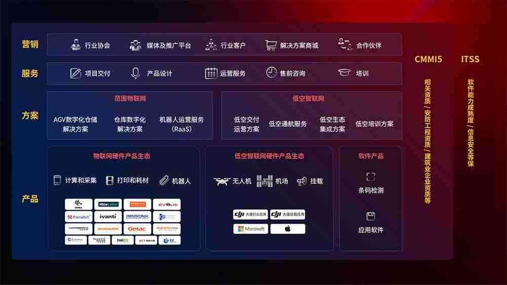 聚合国内外先进的物联网硬件产品品牌,,,聚焦数字化仓储、、、、机器人运营、、、、低空智联网等领域,,,,共同打造适合客户业务场景的解决方案并提供交付服务